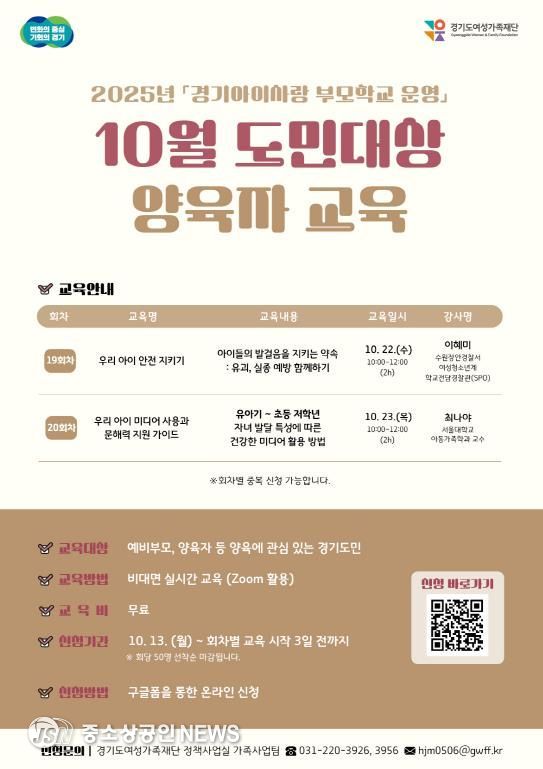 한편 이번 교육은 재단이 경기도 위탁으로 운영하는 ‘2025년 경기아이사랑부모학교’ 사업의 하나로 마련됐다. ‘경기아이사랑부모학교’는 경기도가 건강한 양육 문화 확산을 목표로 도민에게 체계적인 양육자 교육과 1:1 맞춤형 양육상담을 제공하는 사업이다.