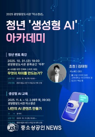 ‘청년 멘토 특강’은 10월 16일 오전 10시부터, ‘생성형 AI 교육’은 10월 21일 오전 10시부터 각각 선착순으로 접수하며, 광양시립도서관 누리집과 전화로 신청할 수 있다. 자세한 사항은 광양중앙도서관으로 문의하면 된다