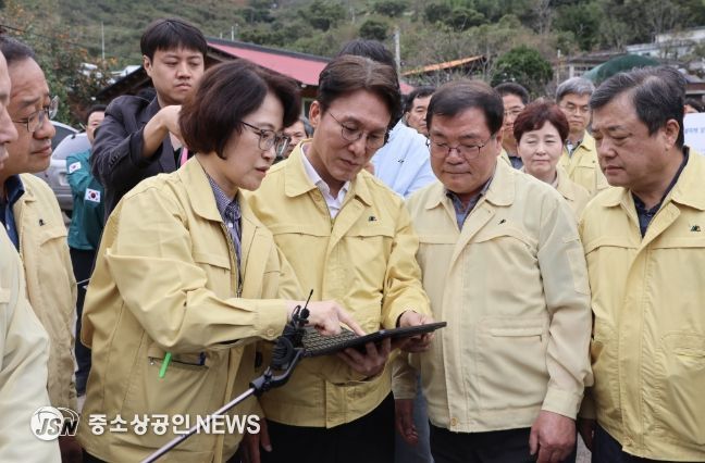 김민석 국무총리는 10월 19일 오후, 올해 3월 21일에 발생한 대형산불에 이어 지난 7월 16일부터 나흘간 내린 집중호우로 큰 피해를 입은 경상남도 산청군을 방문했다.