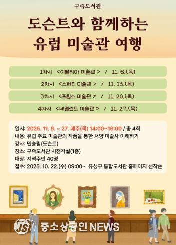 대전 유성구는 11월 6일부터 27일까지 매주 목요일 구즉도서관에서 ‘도슨트와 함께하는 유럽 미술관 여행’ 강연을 개최한다.