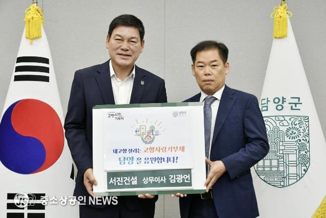 이번 기부는 ㈜서진건설그룹 신명진 회장과 김광언 상무이사가 고향사랑기부제의 취지에 깊이 공감하며 담양군의 지역 발전에 이바지하고자 결정한 것으로, 각각 500만 원씩 총 1,000만 원을 기탁했다.