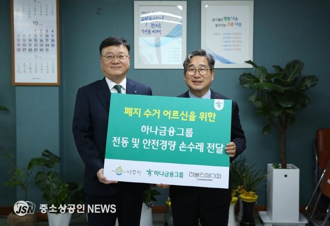 전라남도 나주시가 폐지 수거 어르신들의 안전한 근로환경 조성을 위해 하나금융그룹(회장 함영주)으로부터 전동 및 경량 손수레 32대를 기탁받았다.
