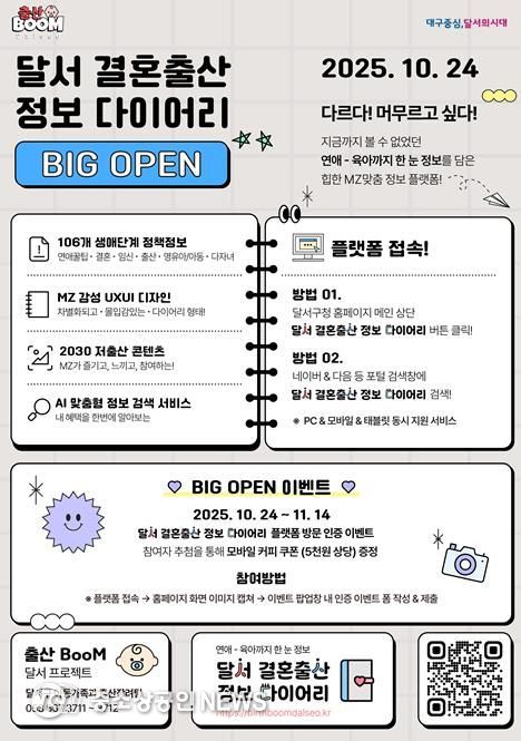 대구 달서구는 전략형 저출산 대응 프로젝트'출산BooM 달서'의 일환으로 연애부터 육아까지 생애주기별 정책 정보를 한눈에 담은 통합정보 플랫폼'달서 결혼출산 정보 다이어리'를 정식 오픈했다고 28일 밝혔다.