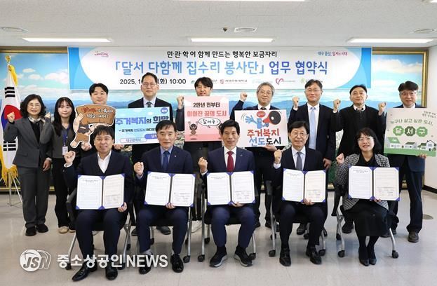 대구 달서구는 28일 구청에서 5개 기관이 참여한 가운데 ‘달서 다함께 집수리 봉사단’ 업무협약식을 열고, 기술 봉사와 복지 서비스를 결합한 새로운 상생형 주거복지 모델의 출발을 알렸다.