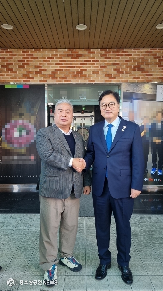 [우원식 국회의장(오른쪽)과 이기성 광주광역시소상공인연합회 회장(왼쪽)이 기념촬영을 하고 있다.] (사진=중소상공이뉴스)