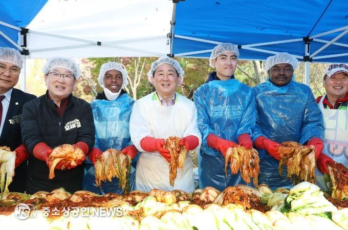 대전 서구는 6일 둔산동 샘머리공원에서 열린 서구 자원봉사센터 주최‘함께하는 기쁨, 사랑 가득 김장 나눔’ 행사에 배재대학교 유학생인 정부 초청 외국인 장학생 30명이 참여했다고 전했다.