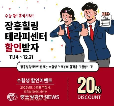 장흥힐링테라피센터는 2025학년도 대학수학능력시험을 치른 수험생들을 응원하기 위해 ‘수능 끝! 휴식시작! 수험표 챙기고 힐링받자 프로모션’을 진행한다고 밝혔다.