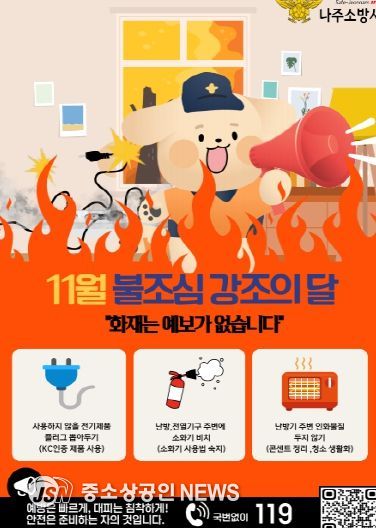 나주소방서(서장 신향식)는 겨울철을 앞두고 화재 발생 위험이 높아지는 시기에 맞춰 ‘11월 불조심 강조의 달’을 운영하여 시민 모두가 함께 실천하는 안전한 난방·전기 화재 예방을 당부했다.