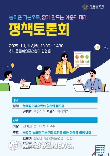 화순군의회는 오는 11월 17일 오후 1시, 하니움문화스포츠센터 만연홀에서 ‘농어촌 기본소득, 함께 만드는 화순의 미래’를 주제로 농어촌 기본소득 정책토론회를 개최한다.