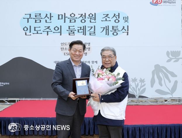 시는 14일 구름산 산림욕장에서 대한적십자사 경기도지사와 함께 개최한 ‘마음정원 조성 및 인도주의길 개통식’에서 이 회장에게 광명시 명예시민증을 수여했다.