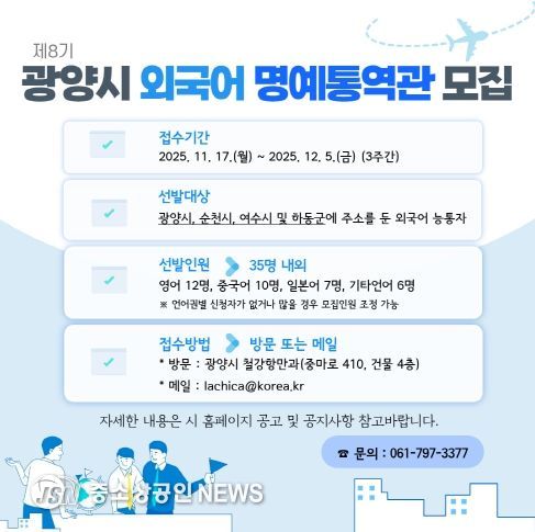 정승재 철강항만과장은 “글로벌 교류가 확대되는 흐름 속에서 전문 통역 인력의 중요성이 더욱 커지고 있다”며 “성장하는 글로벌 광양을 위해 역량 있는 분들의 많은 관심과 참여를 부탁드린다”고 말했다.