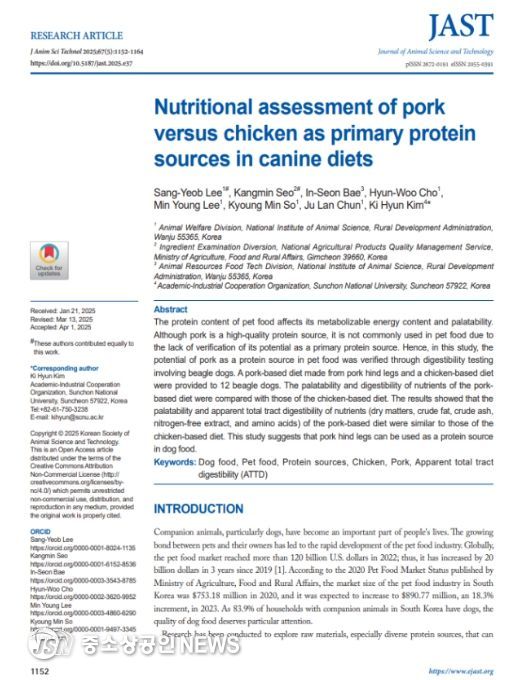 농촌진흥청은 국내산 돼지고기 뒷다리살이 반려견 사료의 단백질 공급원으로 활용될 수 있는지 평가한 결과, 영양적 품질과 기호성 면에서 닭고기 기반 사료와 유사한 수준을 보였다고 밝혔다.