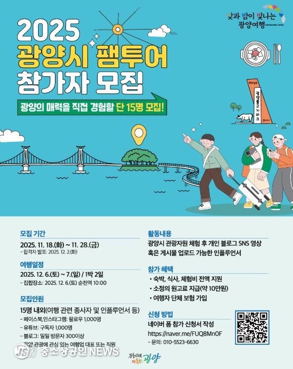 광양시가 낮과 밤이 빛나는 광양의 매력적인 관광자원을 직접 체험하고, 감각적인 콘텐츠로 널리 홍보할 영향력 있는 ‘2025 G-관광 팸투어’ 참가자를 모집한다.