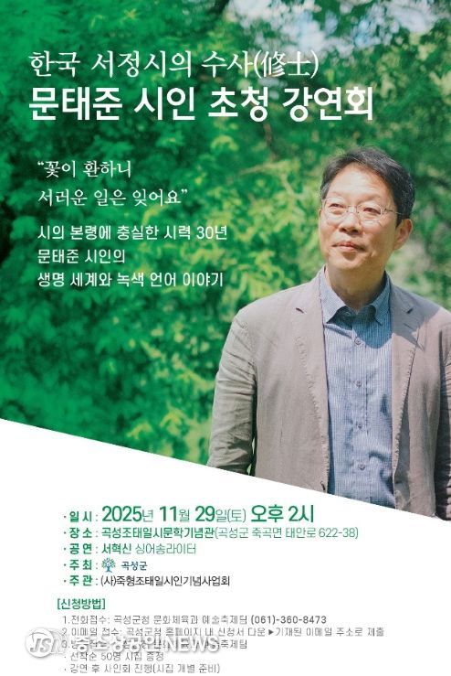 전남 곡성군은 오는 29일‘한국 서정시의 수사(修士)’로 불리는 문태준 시인 강연회가 곡성군 주최, (사)죽형조태일시인기념사업회 주관으로 조태일시문학기념관에서 개최된다고 20일 밝혔다.