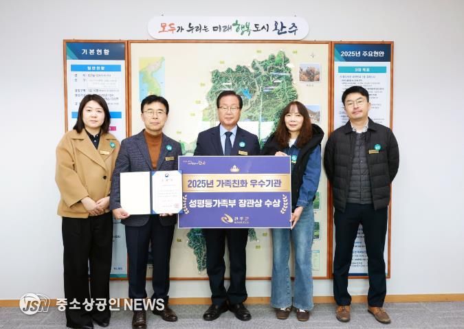 완주군이 지난 20일 한국프레스센터 국제회의장에서 열린 ‘2025년 가족친화 우수기관 유공 정부포상 시상식’에서 성평등가족부장관상을 수상했다.