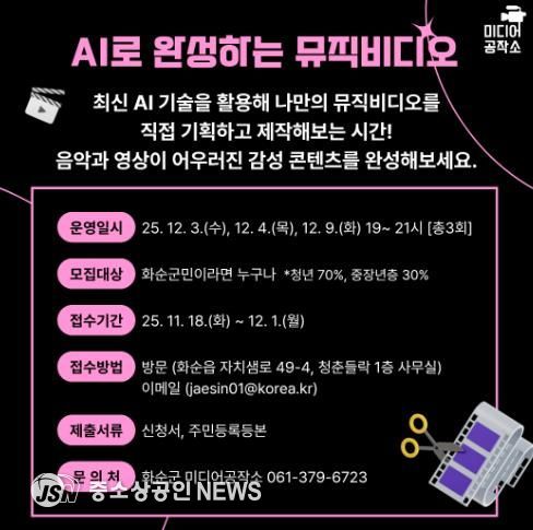 화순군은 오는 12월 3일부터 화순군민을 대상으로 화순군 청년센터(청춘들락) 미디어공작소에서 ‘AI로 완성하는 뮤직비디오 영상 제작하기’ 교육을 진행한다고 밝혔다.