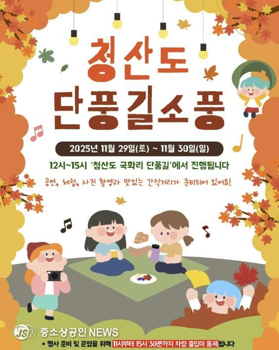 행사는 11월 29일과 30일 오후 12시부터 15시까지 진행되며, 29일에는 차량이 전면 통제돼 주민과 관광객이 안전하고 편안하게 단풍길을 거닐 수 있다.