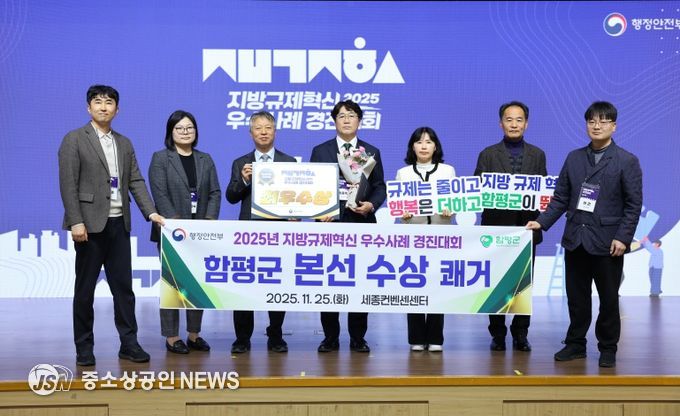 함평군은 26일 ‘농공단지 건폐율 규제 개혁’으로 행정안전부 주관 ‘2025년 지방규제혁신 우수사례 경진대회’에서 최우수상을 수상했다고 밝혔다. 경진대회는 지난 25일 정부세종컨벤션센터 국제회의장에서 개최됐다.