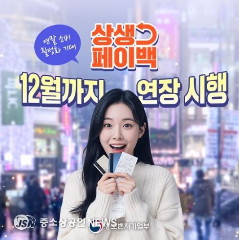 중소벤처기업부(장관 한성숙, 이하 중기부)는 연말 소비 촉진 분위기 확산을 위해 당초 11월까지 시행하기로 한 상생페이백 사업을 12월까지 연장한다고 밝혔습니다.