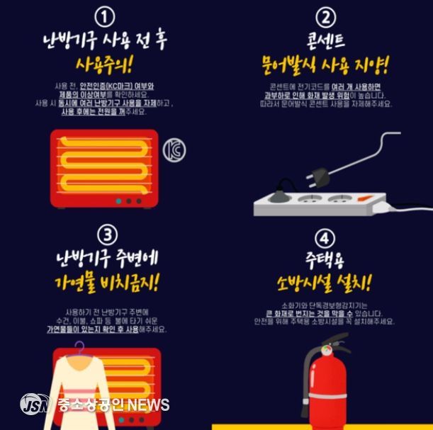 소방서에 따르면 겨울철 난방기구 화재는 대부분 전선 손상 방치, 과열, 주변 가연물 접촉, 남은 불씨 관리 소홀 등 사소한 부주의에서 시작된다. 이를 막기 위해 소방서는 △KC(안전인증) 제품 사용 △사용 전 전선·플러그 손상 여부 점검 △난방기구 주변 이불·빨래·종이 등 가연물 두지 않기 △문어발식 콘센트 사용 금지 △외출·취침 시 전원 및 플러그 완전 차단 등을 필수 안전수칙으로 제시했다.