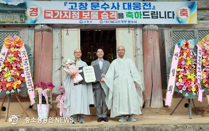 ▲고창 문수사 대웅전(2024.7.17. 보물 지정)=‘고창 문수사 목조석가여래삼불좌상(보물)’이 봉안된 건물이다. 규모는 정면 세 칸, 측면 두 칸이며 단순하면서도 강직한 공포의 형태와 짜임에서 조선 전·중기에 이르는 양식과 전라도의 지역적 특색이 나타난다. 다포계 맞배지붕 기법과 양식을 충실히 갖추고 있으며 단청에도 전통 무기안료와 아교가 사용된 옛 기법이 남아 학술·역사적 가치가 높다.