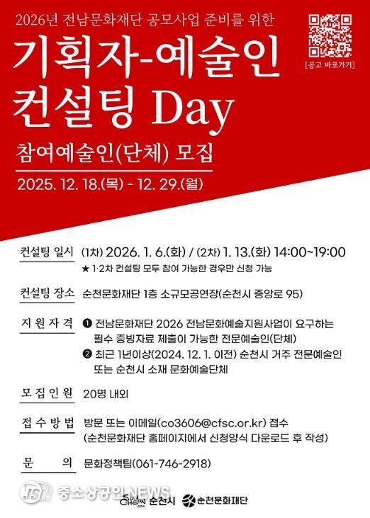 순천문화재단 관계자는 “컨설팅 Day는 순천 지역예술인이 공모사업을 보다 체계적으로 준비할 수 있도록 실질적인 도움을 제공하기 위해 마련된 프로그램”이라며 “전남문화재단 2026 전남문화예술지원사업에 참여를 희망하는 예술인들의 많은 관심과 참여를 바란다”고 말했다.