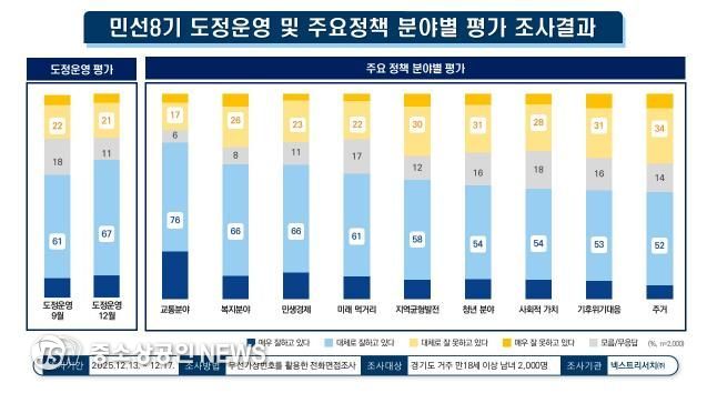 정책 분야별 평가 결과, 교통 분야 긍정 평가가 76%로 가장 높게 나타났으며, 민생경제와 복지 분야는 각각 66%, 미래먹거리 분야는 61%로 집계됐다. 지역균형발전 58%, 기후위기 대응과 청년 분야는 각각 54%, 사회적 가치 분야는 53%였으며, 주거 분야도 52%로 긍정 평가가 과반을 기록했다.