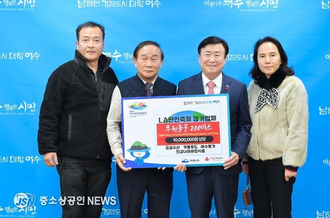 제52회 LA한인축제 및 농수산물 우수상품 엑스포에 참가한 여수지역 4개 업체가 지난 17일 어려운 이웃들을 위해 직접 생산·가공한 멸치, 젓갈, 굴비 장아찌, 갓김치로 구성된 천만 원 상당의 물품을 여수시에 전달했다.