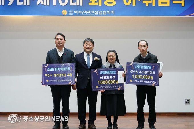 여수시는 (사)여수산단건설업협의회(회장 정성호)가 지난 22일 제9·10대 회장 이취임식에서 관내 취약 복지시설을 위해 후원금과 백미 등 약 1천 7백여만 원 상당의 후원금품을 전달하며 지역사회에 나눔을 실천했다고 밝혔다.