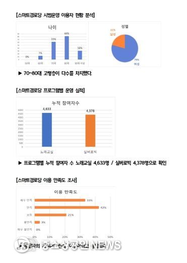 이용자 설문조사 결과에서도 긍정적인 반응이 이어졌다. 응답자의 96%가 사업 운영에 대해 긍정적(만족 이상 75%, 보통 21%)이라고 답했으며, 79%는 이후에도 계속 이용하겠다는 의사를 밝혔다. 이를 통해 사업의 지속 필요성이 확인됐고, 참여자 대부분이 70~80대 고령층으로 스마트경로당이 디지털 취약계층을 대상으로 효과적으로 운영된 것으로 분석됐다.