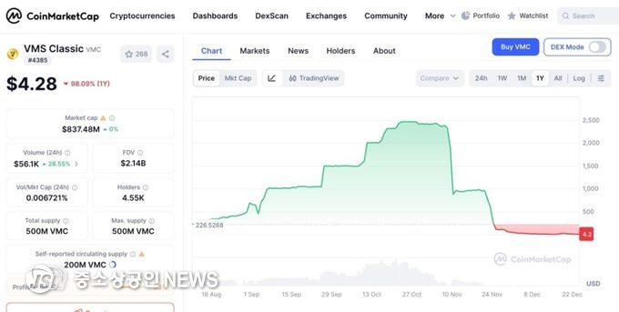 출금정지처분의 결정적 요인은 자체 발행한 VMC 코인이 불법매도된 사건이다. 2025년7월에 최초 미국 거래소인 Bitmart 에 상장한 VMC 는 상장가 $10을 시작으로 높은 상장 시작가임에도 불구하고 2개월만에 $600 대를 돌파했다. 사건이 터지기 11월4일 전까지는 $2,400 까지 넘어서는 놀라운 기록을 보였지만 결국 불법매도가 시작된 LBank 가 빅토리아 거래소를 금융당국에 신고하면서 현재는 상장가 미만으로 가격이 폭락하게 되는 희대의 사건으로 전락하고 말았다.