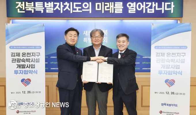 전북특별자치도가 26일 도청 회의실에서 김제시, 베스트웨스턴플러스 김제호텔과 김제 온천지구 관광숙박시설 개발사업 투자협약(MOU)을 체결했다.