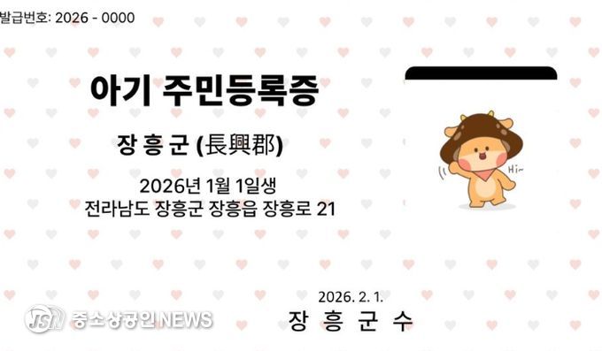 장흥군 관계자는 “아기 주민등록증을 통해 아이의 출생을 기념하며, 가족들에게 따뜻한 추억이 되길 바란다”며 “앞으로도 다양한 출산 장려 정책을 마련해 아이 키우기 좋은 장흥을 만들겠다”고 밝혔다.