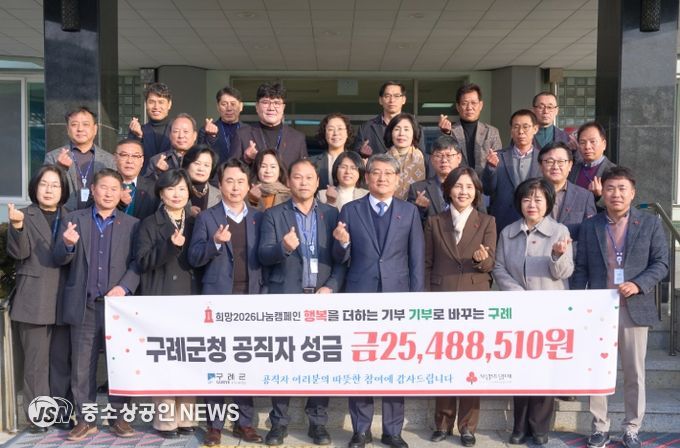 구례군은 군 소속 공직자들이 자발적으로 참여해 모은 성금 25,488,510원을 희망2026나눔캠페인에 기탁하며 연말연시 이웃사랑 실천에 동참했다고 밝혔다.