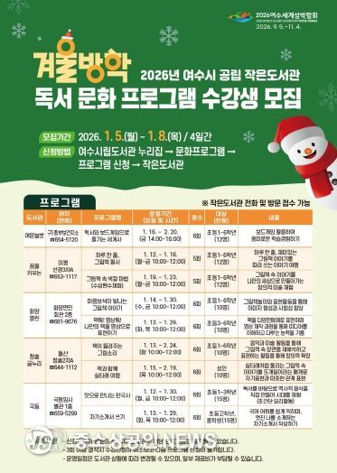여수시가 운영하는 5개 공립 작은도서관에서 오는 2026년 1월 5일부터 8일까지 ‘겨울방학 독서문화 프로그램’ 수강생 106명을 선착순 모집한다.