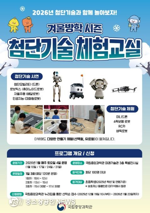 과학기술정보통신부 국립중앙과학관은 겨울방학을 맞이하여 2026년 1월 중 매주 토요일 4일(10일, 17일, 24일, 31일) 동안'겨울방학 시즌 첨단기술 체험교실'을 국립중앙과학관 미래기술관 3층에서 운영한다고 밝혔다.