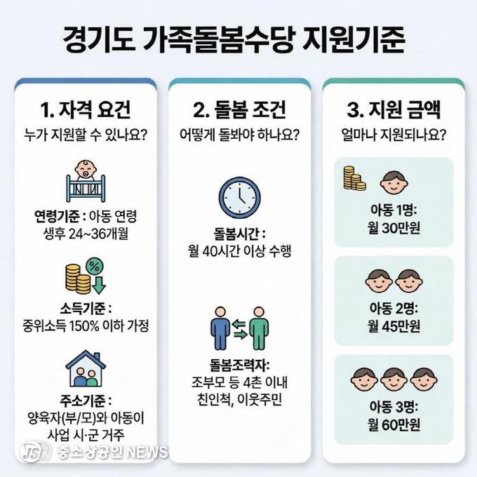신청은 매월 1일부터 15일까지 경기민원24를 통해 온라인으로 가능하며, 돌봄활동 후 그다음 달에 수당이 지급된다.
