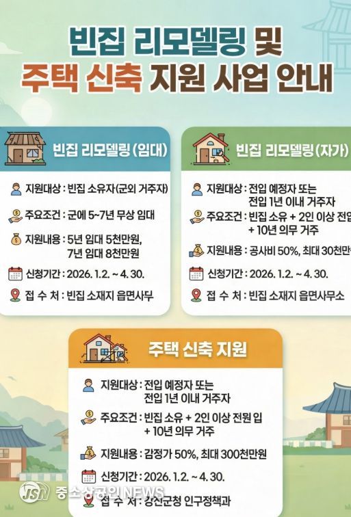 군은 ‘2026년 주택 신축 지원사업’과 ‘상반기 빈집 리모델링 지원사업’을 통해 전입 예정자와 신규 전입자의 주거 안정과 정주 기반 마련을 지원할 계획이다.