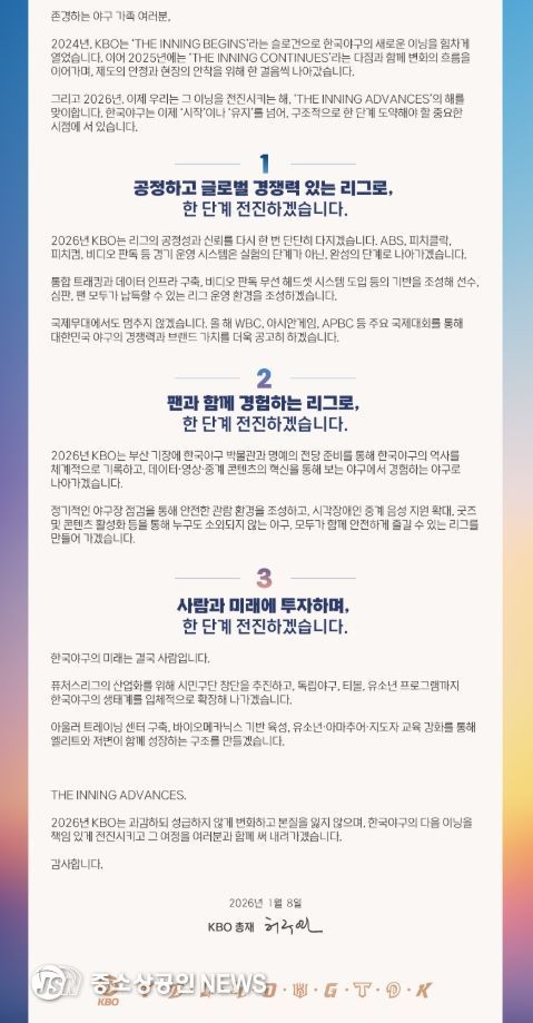 정헌율 익산시장이 1월 7일(수) KBO를 방문해 허구연 총재를 예방했다. KT 위즈의 퓨처스리그 연고지인 익산시는 KBO 퓨처스리그와 KBO의 상생과 활성화 방안에 대해서 논의했다. 조명, 덕아웃, 불펜 등 퓨처스리그 경기장 및 선수 훈련 시설 확충, 지역 시설을 활용한 유소년 선수 훈련 시설 확보 등 전반적인 인프라 개선에 대해 논의했다. 또한 퓨처스리그 경기 개최 및 중계 시 지역 홍보 극대화 방안에 대해서도 의견을 나눴다. 정헌율 익산시장은 “KT 퓨처스리그 팀이 퓨처스리그 챔피언결정전 초대 우승을 차지해 자부심을 느낀다며, 한국야구의 발전을 위해 KBO와 협력할 수 있는 방안을 모색하고, 지자체에서 지원할 수 있는 부분에 대해 적극적으로 고려하겠다”라고 말했다. KBO 허구연 총재는 “야구 발전을 위해서는 퓨처스리그를 비롯해 기초를 튼튼하게 해야 하며, 퓨처스리그와 여자야구 활성화를 위해 아낌없이 지원해주는 익산시에 감사 드린다”고 화답했다. KBO는 앞으로도 지자체들과 지속적으로 협력해 지역 야구 인프라 발전을 위해 노력을 기울일 예정이다.