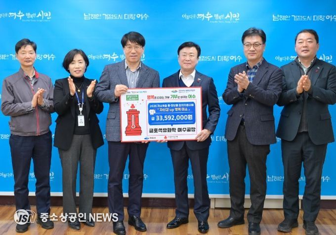 여수시는 오늘(13일) 금호석유화학 여수공장(공장장 장갑종)이 생활이 어려운 중장년층의 무료 의치 지원사업을 위해 3천 3백여만 원의 후원금을 전달했다고 밝혔다.