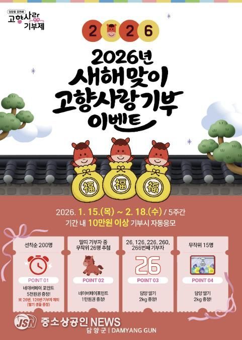 담양군이 2026년 병오년(丙午年) ‘붉은 말의 해’를 맞아 1월 15일부터 2월 18일까지 5주간 고향사랑기부 이벤트를 실시한다.