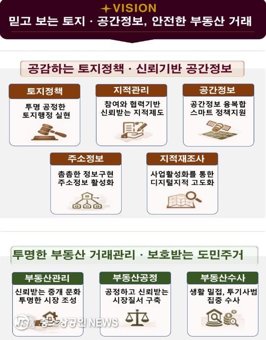 추진계획은 ▲투명하고 균형 잡힌 제도 운영으로 신뢰받는 토지행정 실현 ▲참여와 협력을 통한 신뢰받는 지적제도 정착 ▲공간정보 융·복합을 통한 스마트한 정책 지원 ▲촘촘한 주소정보 구현 및 주소정보 활성화 추진 ▲사업활성화를 통한 디지털지적 고도화 ▲신뢰받는 중개 문화와 투명한 부동산 시장 조성 ▲공정하고 신뢰받는 시장질서 구축 ▲생활밀접, 투기사범 집중수사 등 8대 전략을 바탕으로 한 92개 세부 이행과제로 구성됐다.
