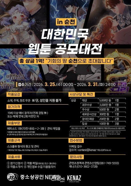 시 관계자는 “이번 공모대전은 전국의 신인 창작자들에게 웹툰 데뷔의 발판을 마련해 줄 뿐 아니라, 순천시가 웹툰 산업의 새로운 거점으로 자리매김하는 계기가 될 것”이라며 “많은 창작자들의 도전과 참여를 기대한다”고 말했다.