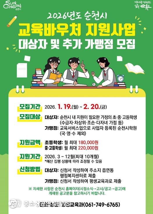 순천시가 가정형편 등으로 학원 수강이 어려운 취약계층 가정 학생들에게 수강료를 지원하는 교육바우처 사업을 시행한다.