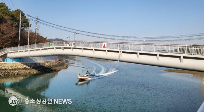 태인보도교는 태인동 도촌마을과 금호동 금섬해안길을 잇는 보행 전용 교량으로, 총연장 63.5m, 폭 5.0m, 높이 4.45m 규모로 조성됐다.