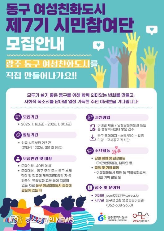 광주 동구는 주민이 직접 참여해 여성친화도시 정책을 만들어가는 ‘제7기 동구 여성친화도시 시민참여단’을 이달 30일까지 모집한다고 밝혔다.