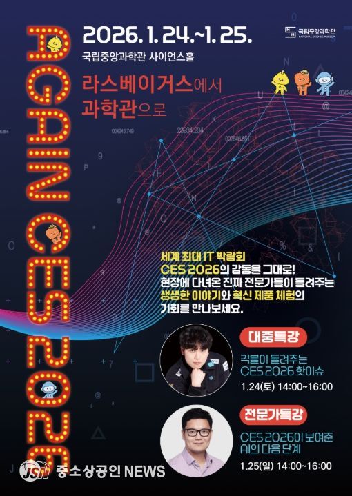 미래의 꿈을 만드는 과학기술 문화 이음터(플랫폼) 과학기술정보통신부 국립중앙과학관은 1월 24일부터 1월 25일까지 이틀간 국립중앙과학관 사이언스 홀에서 세계 최대 정보 기술(IT) 박람회인 2026 미국 가전 전시회(CES 2026)를 되짚어 보는 행사를 개최한다.