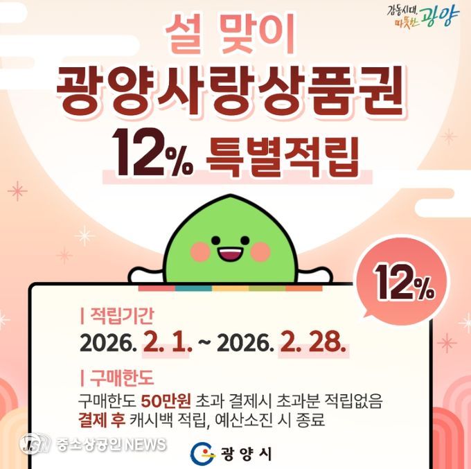 광양시는 설 명절을 맞아 지역 내 소비를 촉진하고 민생경제 회복을 지원하기 위해 2월 1일부터 28일까지 한 달간 광양사랑상품권 캐시백 적립률을 기존 10%에서 12%로 한시 상향 운영한다고 밝혔다.