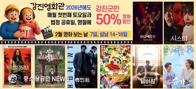 강진군이 민족의 대명절 설을 맞아 군민 모두가 부담 없이 영화를 즐길 수 있도록 오는 2월 7일과 2월 14일부터 18일까지 ‘2026년 영화 보는 날’ 행사를 운영한다.