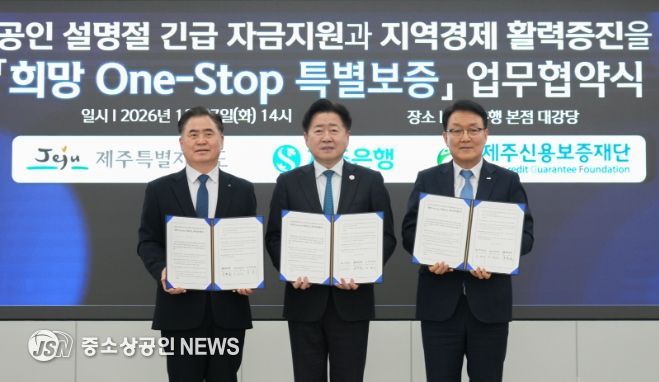 제주도는 27일 제주은행 본점에서 제주은행, 제주신용보증재단과 함께 소상공인 설명절 긴급 자금지원과 지역경제 활력 증진을 위한 ‘희망 원스톱(One-Stop) 특별보증’ 업무협약을 체결했다.